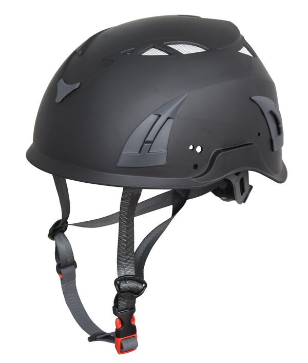 Casque ABS ultra léger, coiffe thermoformée, jugulaire réglable, 10 fentes de ventilation pour plus de confort. Serrage par molette de réglage adaptée pour des tours de tête de 52 à 61 cm. Encoches latérales pour fixation visière, crochets pour lampe frontale, fentes latérales pour fixations auditives.