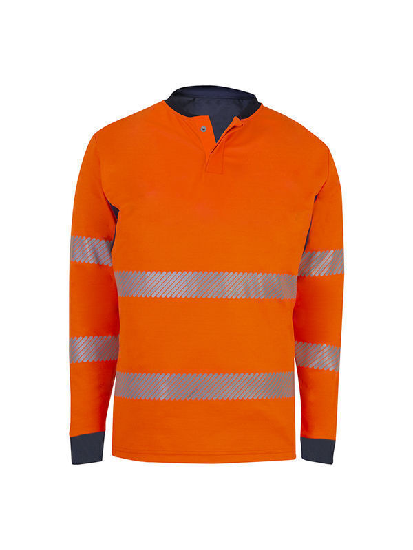 Polo haute visibilité maille double face ignifugée et antistatique. Col cycliste fermé par 2 boutons avec double patte, biais de propreté. Renforts d’épaules. Empiècement contrasté au dos du polo et sous bras. Manches longues, poignets contrastés. Dos protège-reins. Ourlet au bas du polo. 2 ceintures et 2 brassards rétroréfléchissants microbilles segmentés RETHIOTEX® de 5 cm thermocollés.