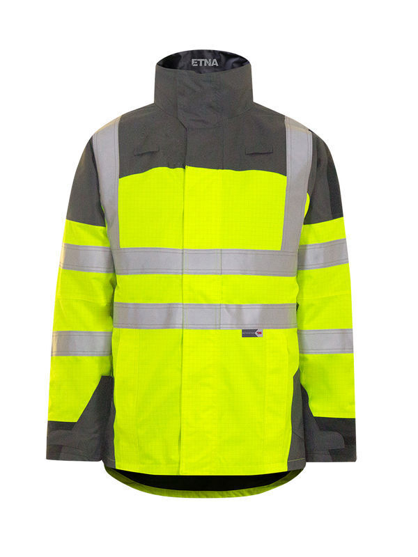 Parka avec fermeture à glissière, sous rabat fermé par 6 boutons-pression. Passe-mains fermés par 2 auto-agrippant non feu et 2 boutons-pression. 2 poches basses avec rabat fermé par zip. Poche Napoléon zippé sous rabat central. Poche portable intérieure fermée par bouton-pression. 2 pattes de fixation poitrine pour micro déporté. Manches préformées. Dos protège-reins. Bas de manches avec patte de serrage par boutons-pression. 2 ceintures, 2 bretelles et 4 brassards rétroréfléchissants microbilles RETHIOTEX® non feu de 5 cm cousus. Trappe de marquage. | Mercerie tout plastique. Système d’accueil capuche optionnelle KACHUCHA. Fit&Zip : système de zip et pattes d’accroches pour fixation du gilet ETNA ou de la polaire CALDERA.