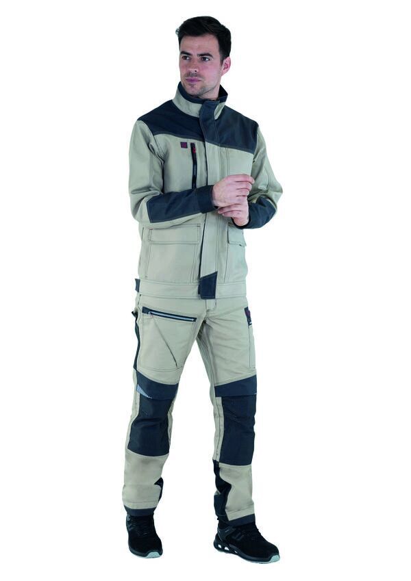 Pantalon à poches genouillères. Ceinture élastiquée côtés, 6 passants doubles. 2 poches italiennes dont 1 avec poche monnaie, 1 poche cuisse à soufflet avec rabat à grippers, 1 poche mètre en biais avec surpoche, 1 poche cuisse à rabat avec poche mètre intégrée et surpoche téléphone. 2 poches genouillères en tissu renforcé réglables en 2 niveaux de hauteur avec ouverture par le haut. Sangle porte-outils. Renforts arrières bas de jambes. E.J. : 82 cm + ourlet de 5 cm