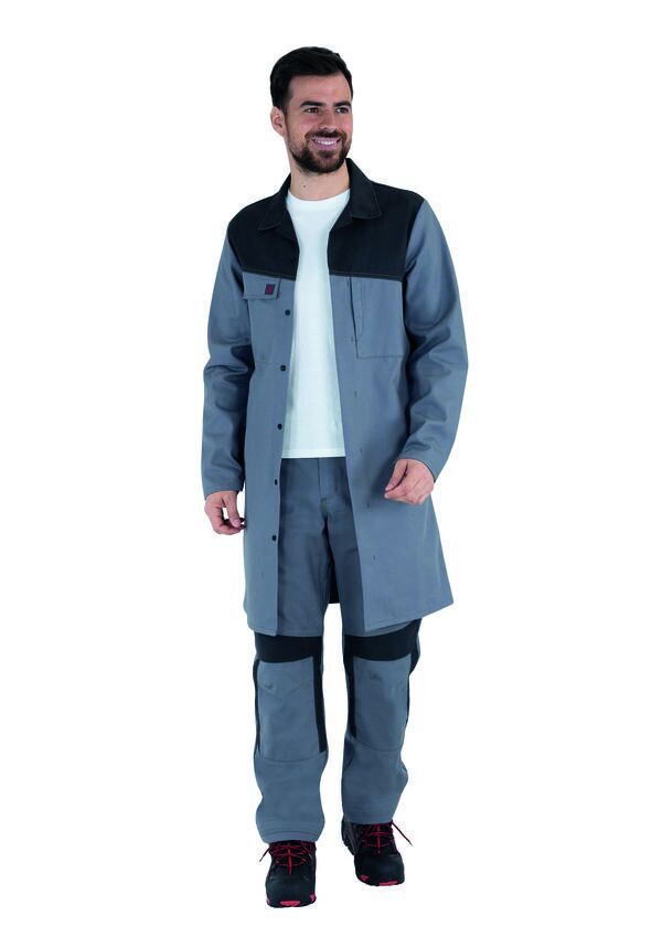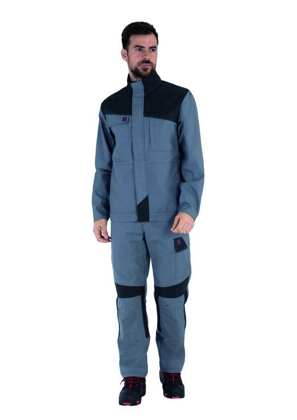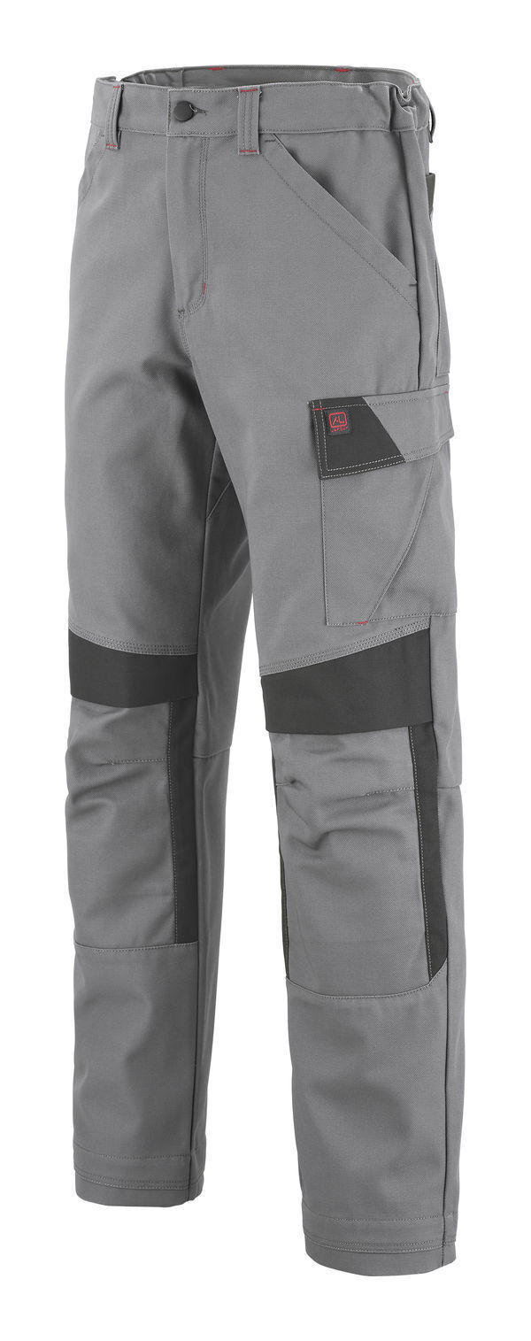Pantalon à poches genouillères. Ceinture droite élastiquée côtés, fermée par bouton clou. Collerette de marquage. Braguette zippée. Poches italiennes doublées. Poches revolver plaquées. Panneau d’aisance à l’entrejambe. Double poche mètre avec bas volant. Poche cuisse gauche avec soufflet central, sous rabat fermé par Velcro® cachés. Pinces jambe dos. Poches genoux 2 niveaux de réglage avec rabat fermé par Velcro®. Bas de jambes évolutifs. Mercerie tout plastique. Surpiqûres contrastées. E.J. : 82 cm (+ 5 cm).