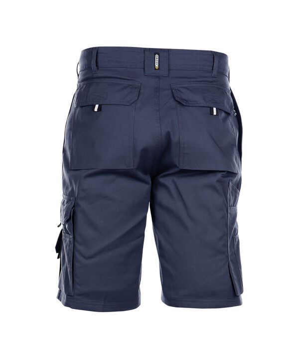 Bermuda multipoches. Fermeture à glissière et bouton jean, serrage élastique dos réglable. 2 poches italiennes. 2 poches arrières avec rabat. 2 poches cuisses. Poche outils. Porte-crayon. Poche mètre. Poche téléphone. Poche de sécurité avec fermeture à glissière. Coutures triples. E.J. : 28 cm.