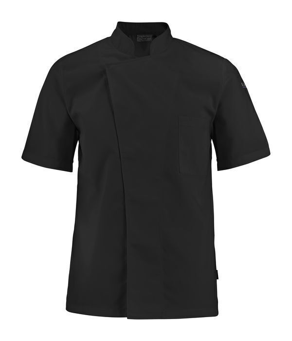 Veste de cuisine mixte à col officier. Fermeture asymétrique par boutons-pression cachés. Poche poitrine plaquée côté gauche avec compartiment stylo. Œillets d’aération. Manches courtes.