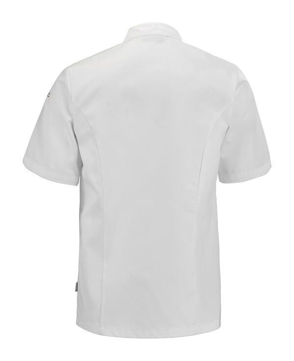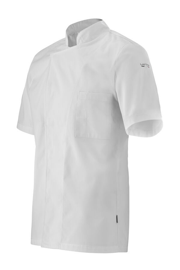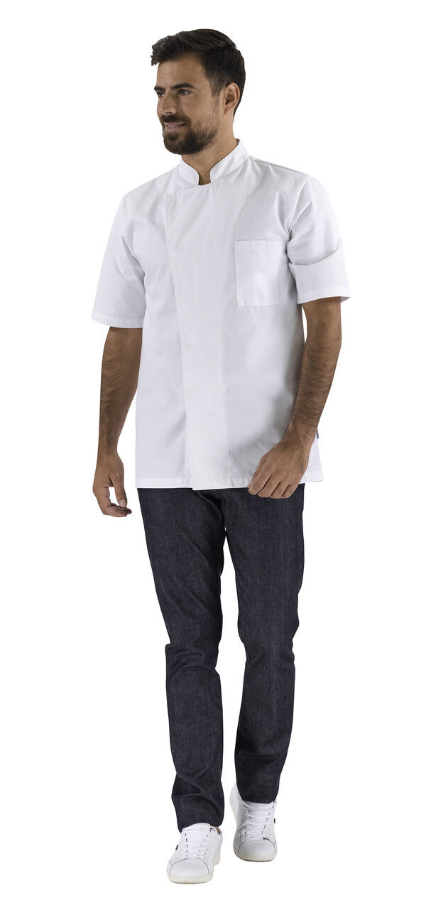 Veste de cuisine mixte à col officier. Fermeture asymétrique par boutons-pression cachés. Poche poitrine plaquée côté gauche avec compartiment stylo. Œillets d’aération. Manches courtes.
