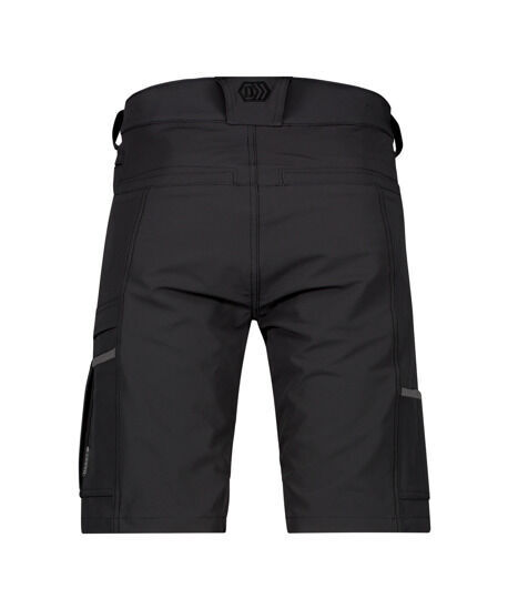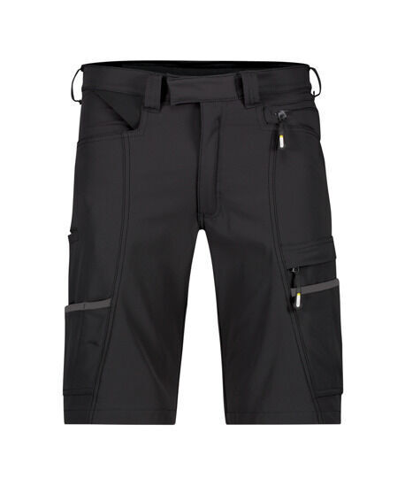 Bermuda full stretch. Ceinture avec passants, serrage élastique dos réglable. Fermeture centrale par crochet cachée avec pression. Braguette zippée. 2 poches italienne. Poche cuisse de sécurité à rabat fermée par zip. Porte-crayon. Poche cutter. Poche téléphone. Boucle porte badge. Anneau en D. 2 poches dos plaquée dont poche droite avec rabat. | Coupe slim fit. E.J. : 28 cm.
