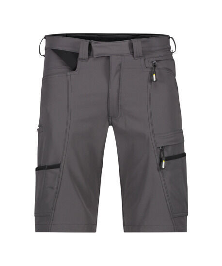 Bermuda full stretch. Ceinture avec passants, serrage élastique dos réglable. Fermeture centrale par crochet cachée avec pression. Braguette zippée. 2 poches italienne. Poche cuisse de sécurité à rabat fermée par zip. Porte-crayon. Poche cutter. Poche téléphone. Boucle porte badge. Anneau en D. 2 poches dos plaquée dont poche droite avec rabat. | Coupe slim fit. E.J. : 28 cm.