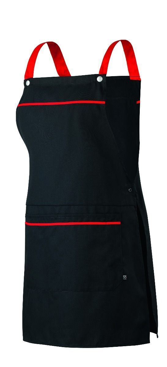 Chasuble à bretelles contrastées avec calottes. Pattes de serrage côté réglables par 3 boutons-pression. Grande poche centrale sur le devant dont une poche stylo. Biais contrasté haut de bavette et poche centrale.
