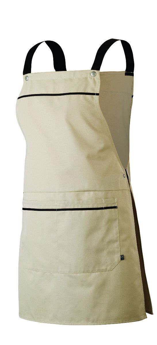 Chasuble à bretelles contrastées avec calottes. Pattes de serrage côté réglables par 3 boutons-pression. Grande poche centrale sur le devant dont une poche stylo. Biais contrasté haut de bavette et poche centrale.