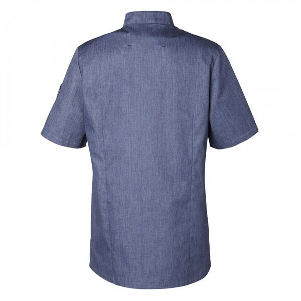 Veste de cuisine femme à col officier. Fermeture asymétrique avec patte en gros grains, 7 boutons-pression cachés. Oeillets d'aération. Fentes côtés. Pince dos. Manches courtes avec poche côté gauche dont un compartiment stylo.