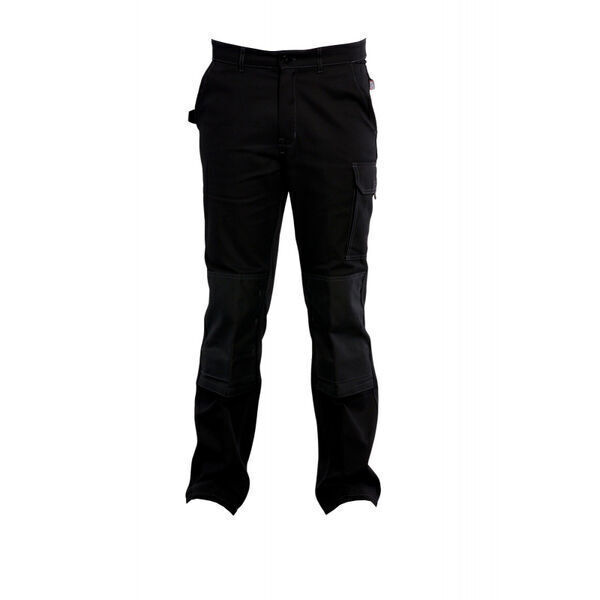Pantalon à poches genouillères bicolore. Ceinture élastiquée dos et boutonnière de réglage intérieure. Braguette à glissière nylon. Pinces dos. 2 poches italiennes sac de poche dans le même tissu et entrée de poche noire. 1 poche cuisse à soufflet rabat fermé par Velcro®. Double-poche porte-outils, accroche-marteau. Poche téléphone. Poche dos rabat Velcro®. Poches genouillères Cordura® 2 positions fermées par bandes Velcro®. E.J. : 82 cm.