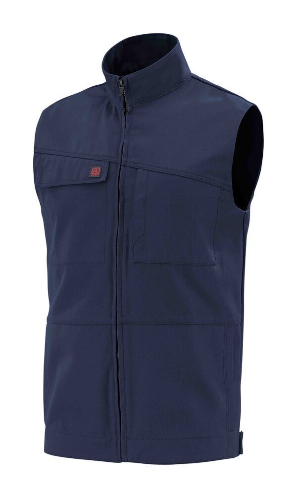 Gilet, col montant. Fermeture milieu devant par zip. 2 poches poitrines : droite incrustée sous rabat fermé par Velcro® cachés, gauche avec ouverture verticale fermée par Velcro® caché. 2 poches basses verticales. Découpes asymétrique devant et dos. Ceinture droite avec pattes de serrage réglable par pressions cachées. Sans manches avec enformes emmanchures. Mercerie tout plastique.