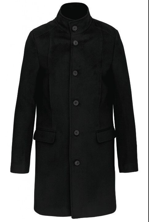 Manteau homme. Fermeture milieu devant 6 boutons. 2 poches repose mains pressionnées sous poitrine, 2 poches basses à rabat. Manches tailleur avec bas de manches 4 boutons. 2 poches intérieures dont une fermée par zip. Entièrement doublé.