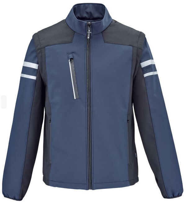Veste softshell col montant. Fermeture à glissière cachée. Poche poitrine à fermeture à glissière étanche rétroréfléchissante, 2 poches à zip inversé dans découpe devant. Manches amovibles, 2 brassards rétroréfléchissants, finition bas de manches biais élastiqué. Bas de vêtement réglable par cordon élastiqué et stopper. 2 bandes rétroréfléchissantes milieu dos. | Système d'attache au dos et bas de manches pour insérer dans parka KYRILL.