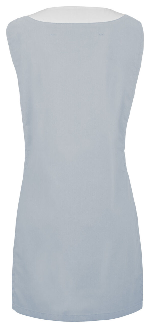 Chasuble femme. Encolure V contrastée, collerette de marquage intérieur. Poche poitrine passepoilée. 2 poches basses passepoilées. Passant porte-badge. Patte de réglage côtés avec grippers cachés 2 positions. Longueur : 80 cm.