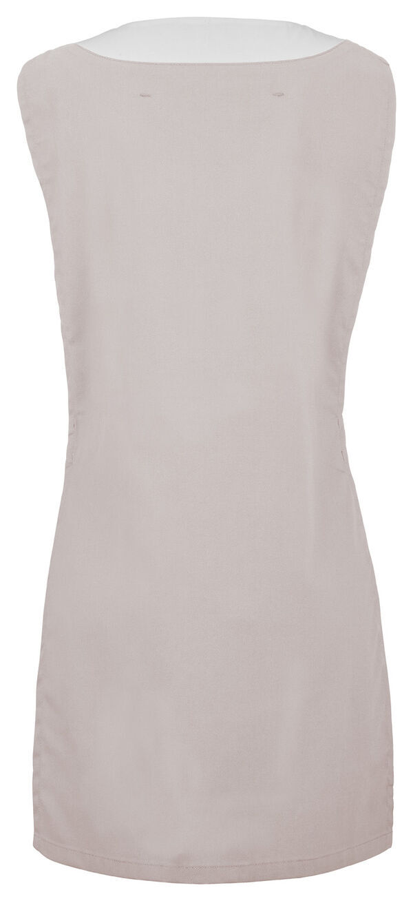Chasuble femme. Encolure V contrastée, collerette de marquage intérieur. Poche poitrine passepoilée. 2 poches basses passepoilées. Passant porte-badge. Patte de réglage côtés avec grippers cachés 2 positions. Longueur : 80 cm.
