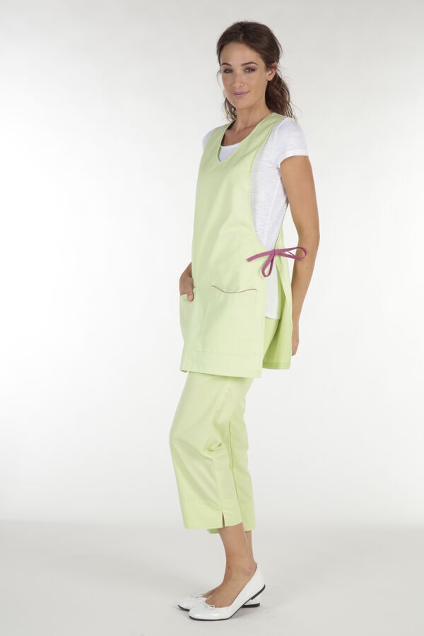 Chasuble femme. Encolure fantaisie ton sur ton. 2 poches basses plaquées avec passepoil contrasté. Fermetures côtés par lacets. Fentes côtés. Longueur : 75 cm.