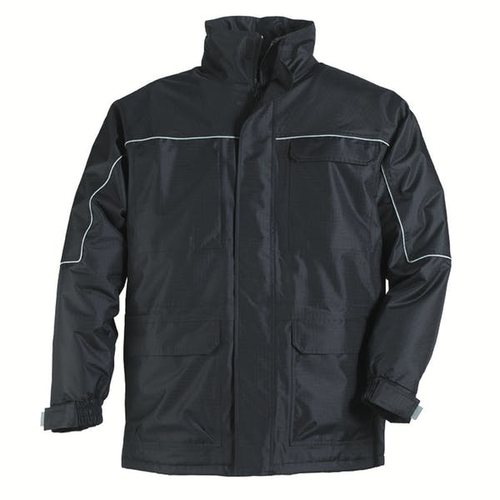 Matière extérieure >> 100% polyester Ripstop pongée enduit PVC, Imperméable, Coutures étanchées, Liseré rétro-réfléchissant démarquant empiècement haut jusqu’au poignet Matière intérieure >> Haut polaire noire 100% polyester 280g/m2. Bas 100% polyamide. Matellassage ouate 120g/m2 Fermeture >> Zip simple avec rabat autoagrippant Capuche >> Dans le col, doublée, serrage avec cordon réglable par bloque cordon Manches >> Doublées matelassées terminées par poignets élastiques, réglables par bandes agrippantes Serrage bas >> Taille élastique de serrage avec bloque cordons centraux intérieur. Bas élastique de serrage avec bloque-cordons centraux intérieurs