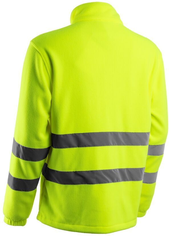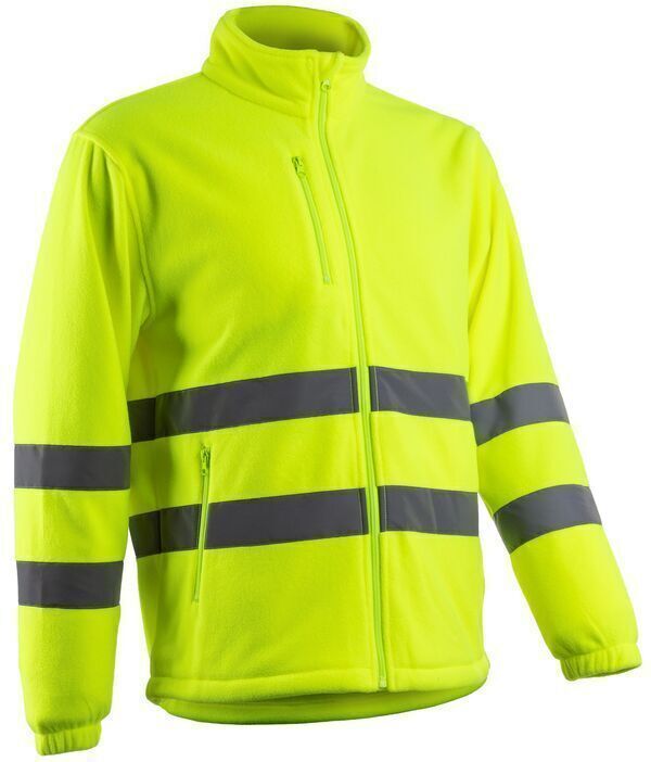 Polaire haute visibilité. Col montant. Fermeture par zip milieu devant avec protège-menton. Poche poitrine zippée. 2 poches basses zippées, poche pointrine zippée. 2 poches basses intérieures. Manches longues, poignets élastiqués. Bas réglable par cordon élastique. | Bandes rétroréfléchissantes : 50 mm.