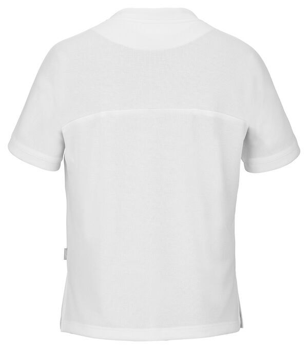 T-shirt mixte. Col biseauté. Poche poitrine passepoilée avec compartiment stylo. Manches finition rapportée. Dos rallongé. Fentes aux côtés.