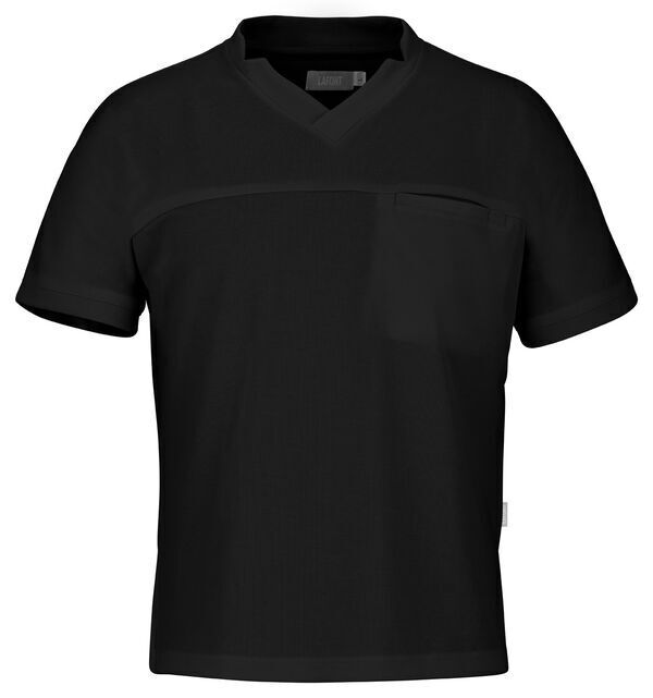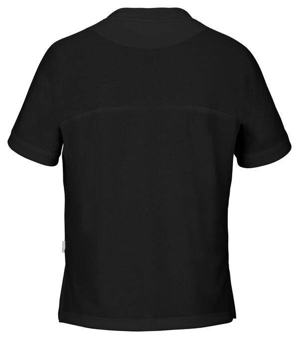 T-shirt mixte. Col biseauté. Poche poitrine passepoilée avec compartiment stylo. Manches finition rapportée. Dos rallongé. Fentes aux côtés.