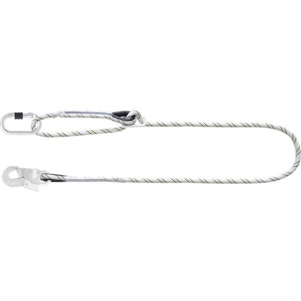 Longe de maintien au travail en corde tressée, réglable de 1,20 m à 2 m. 1 mousqueton acier à verrouillage à vis ouverture 18 mm et 1 mousqueton acier à verrouillage automatique double action ouverture 18 mm.