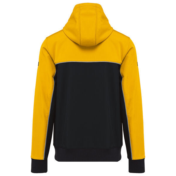 Veste softshell 3 couches bicolore. Capuche réglable par cordons élastiqués. Fermeture à glissière ton sur ton. Bande de propreté contrastée. 2 poches latérales avec fermeture à glissière. Porte-stylo élastiqué sur manche gauche. Bord-côte sur bas de manches et taille. | Passepoil contrasté entre les parties bicolores poitrine, manche, devant et dos. Biais contrasté