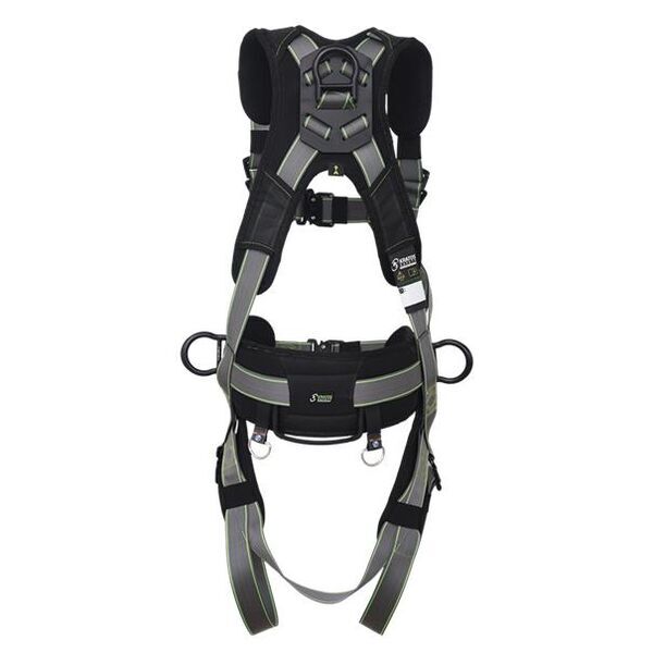 Harnais 4 points dosseret épaule renfort maille : 1 dé dorsal, 1 accrochage sternal formé de 2 boucles textile pour système antichute, 2 dés latéraux pour maintien au travail. Sangles épaules ajustables avec boucles de réglage. Sangle sternale ajustable. Ceinture et sangles de cuisses à boucles automatiques. 2 boucles porte-outils sur la ceinture. 2 anneaux d'accrochages de longes sur les bretelles. | Testé 140 kg.