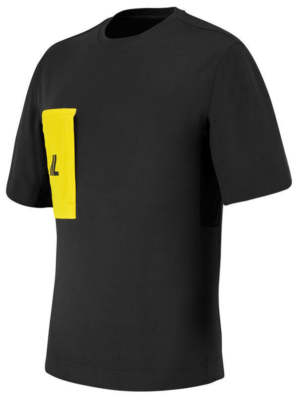 Tee-shirt. Col rond avec bande de propreté. Poche poitrine droite contrastée fermée par fermeture à glissière inversée. Manches courtes. Empiècements filet latéral sous les bras. Découpes cotés.