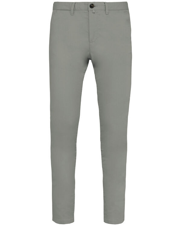 Pantalon chino. Fermeture braguette zippée et bouton cousu. Ceinture avec 5 passants. 2 poches italiennes. 2 poches arrières passepoilées. Ourlet invisible et fentes côtés. Coupe moderne. Finition peau de pêche.