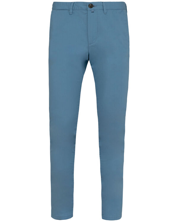 Pantalon chino. Fermeture braguette zippée et bouton cousu. Ceinture avec 5 passants. 2 poches italiennes. 2 poches arrières passepoilées. Ourlet invisible et fentes côtés. Coupe moderne. Finition peau de pêche.