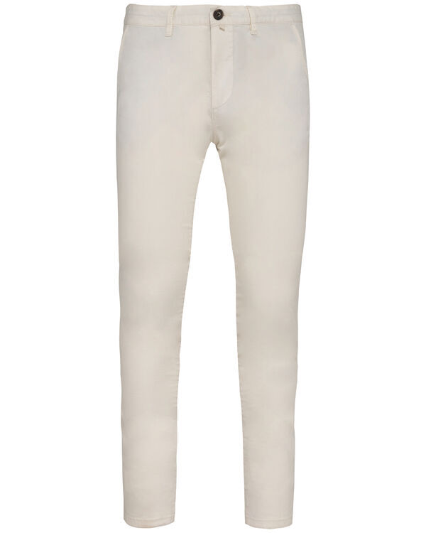 Pantalon chino. Fermeture braguette zippée et bouton cousu. Ceinture avec 5 passants. 2 poches italiennes. 2 poches arrières passepoilées. Ourlet invisible et fentes côtés. Coupe moderne. Finition peau de pêche.