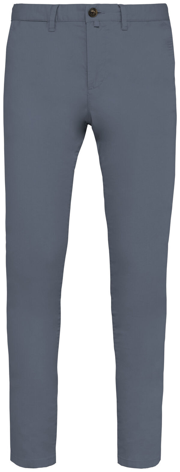 Pantalon chino. Fermeture braguette zippée et bouton cousu. Ceinture avec 5 passants. 2 poches italiennes. 2 poches arrières passepoilées. Ourlet invisible et fentes côtés. Coupe moderne. Finition peau de pêche.