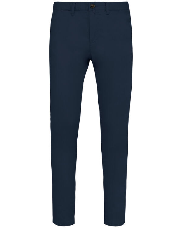 Pantalon chino. Fermeture braguette zippée et bouton cousu. Ceinture avec 5 passants. 2 poches italiennes. 2 poches arrières passepoilées. Ourlet invisible et fentes côtés. Coupe moderne. Finition peau de pêche.