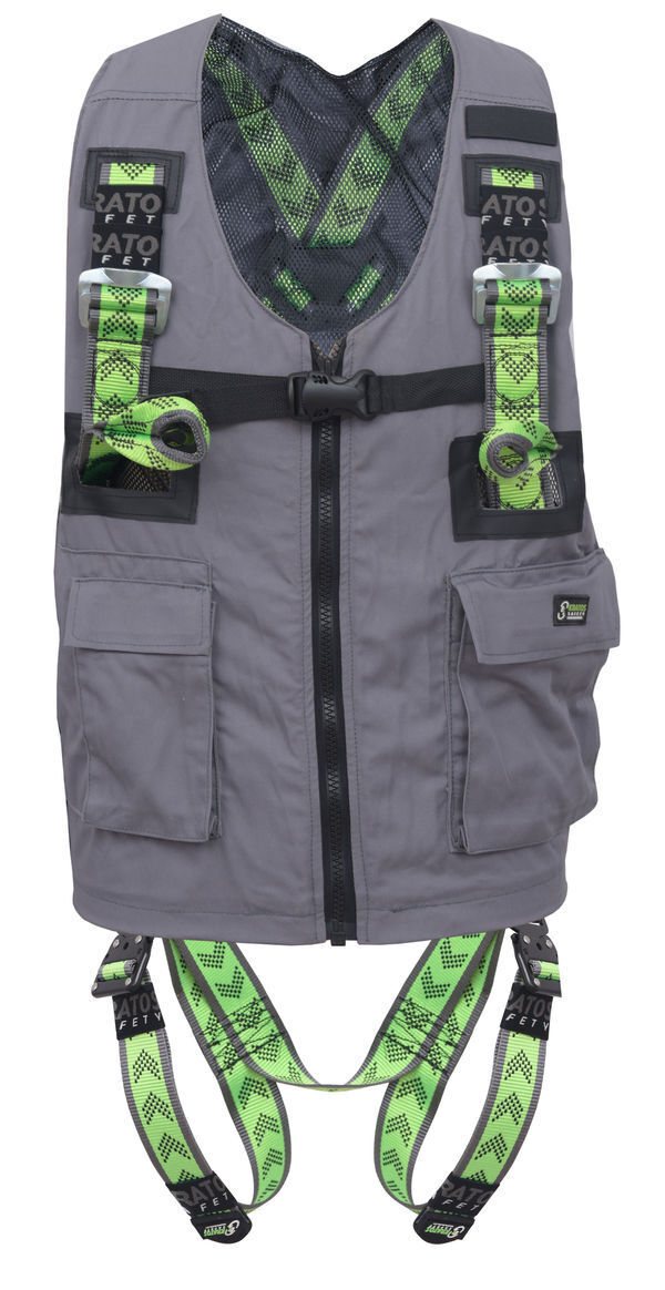 Harnais 2 points équipé d'un gilet de travail haute visibilité. Bandes rétroréfléchissantes et système de zip ajustable. Sangle polyester. Points d'accrochage : 1 dé dorsal, 1 accrochage sternal formé de 2 boucles textile pour système antichute. Épaules, cuisses et gilet ajustables. Fermeture par boucles automatiques. | Testé 140 kg