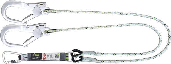 Longe fourche en drisse polyamide 11 mm, avec absorbeur d'énergie, un mousqueton aluminium à verrouillage à vis et 2 mousquetons échafaudage aluminium. Résistance : 6 kN. Poids : 1,79 kg.