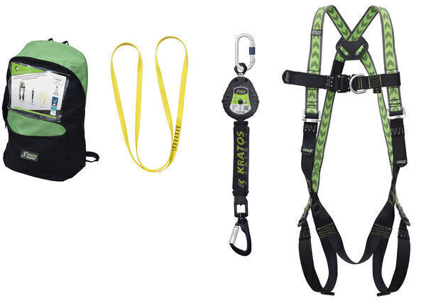 Kit composé d'un harnais 2 points dorsal et sternal, avec boucles automatiques, 1 antichute à rappel automatique sangle 2 m équipé de 2 connecteurs montés sur émerillon ouverture 17 mm, 1 anneau d'ancrage en sangle 20 mm de longueur 1,20 m. | Fourni dans un sac à dos avec poche extérieure à zip d'une capacité de 12L.
