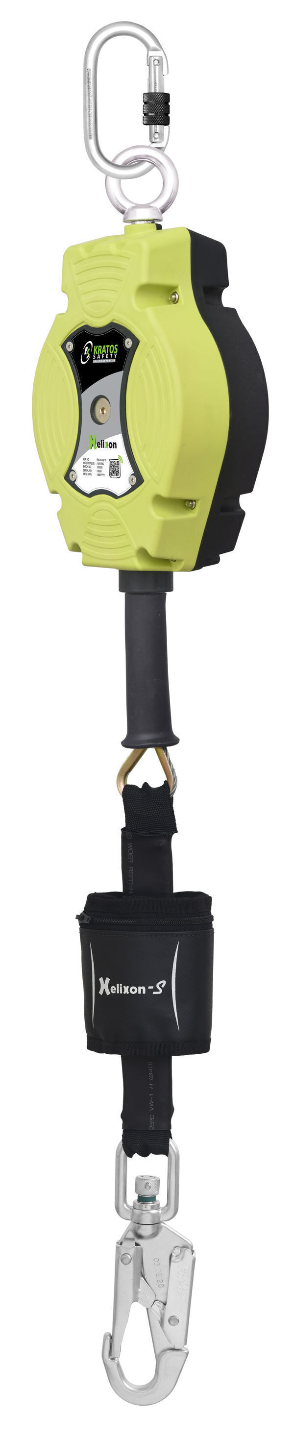 Enrouleur à rappel automatique HELIXON-S. Carter polymère équipé d'un émerillon, avec câble acier galvanisé diamètre 4,8 mm spécial arête vive longueur : 10 m. Mousqueton tournant, double sécurité, avec témoin de chute. Fenêtre amovible sur carter permettant de visualiser l'état du mécanisme. Brosse de nettoyage à l'entrée du carter. Existe en CABLE INOX (longueur 10 m et 20 m)